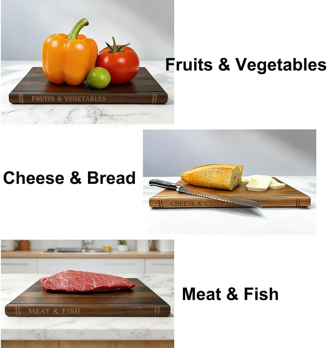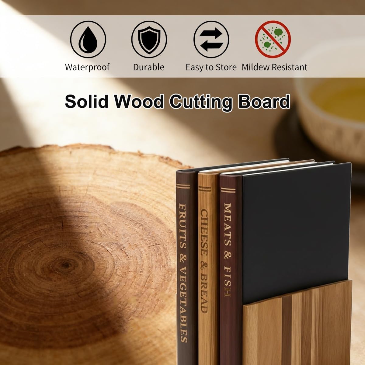Book-Themed Cutting Board SetBring literary charm to your kitchen with our Book Cutting Board Set. This unique Serving Board Set of 3 is crafted from solid Chopping Board Wood, designed to resemble a collection of classic hardcover books when displayed on the included stand. Each Thick Carving Board offers the reliable performance of a Non-Slip Butcher Block, making food preparation both practical and aesthetically pleasing.Why You'll Love This SetClever book-spine design creates a decorative kitchen displayThree dedicated boards help organize food prep tasksSolid wood construction provides a sturdy, dependable cutting surfaceFeatures a sealed finish treated with food-contact oilsIncluded Stand is built at 0.5 in thick for superior stabilityProduct SpecificationsMaterial: Solid WoodLarge Board: 13" L x 10" W x 0.8" HStand Dimensions: 7.9" L x 3.3" W x 5.9" HFeature: Non-slip, vertical storage designPackage Contents3 × Book-Shaped Cutting Boards1 × Matching Wooden Display Stand