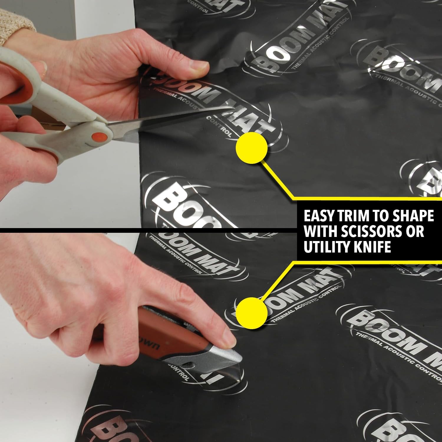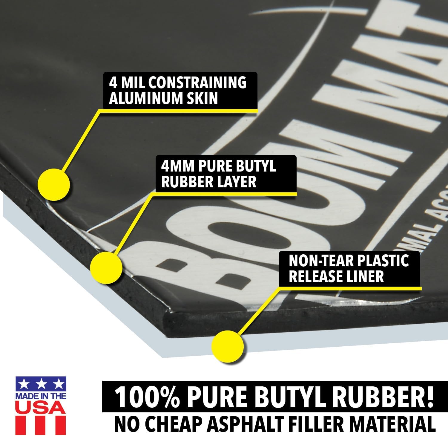 A premium quality deadening material, Boom Mat XL is 4mm thick and is 166% thicker than DEI’s original damping material, providing extreme noise deadening for the most extreme commercial and sound competition applications. Interior panels vibrate and generate noise. Boom Mat stops that noise by trapping it between thick, 4 mil aluminum stiffening top skin, and the asphalt free, pure butyl, noise constraining layer. Plus, worry-free no sag adhesion to any interior surface, vertical or overhead, even in the most demanding of temperature extremes. Those quality components are what make Boom Mat Vibration Deadening Material require only 25-50% coverage to get the job done. This saves weight, material cost and installation time. Boom Mat out performs the competition and is the first choice by the industries top custom car builders, restoration experts and luxury car OE Manufacturers.