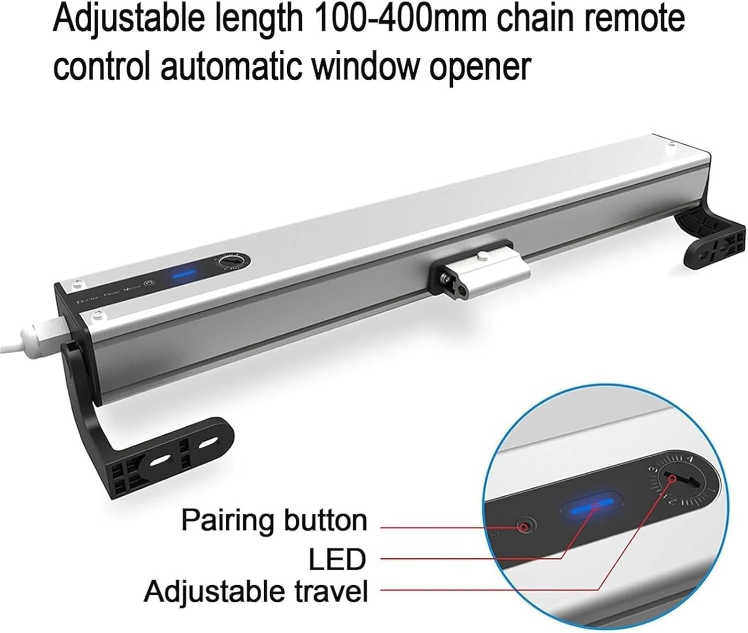 Upgrade your smart home with our electric window opener. Perfect as a greenhouse vent opener or automatic curtain opener, it features a durable chain, remote control, and silent operation for easy air ventilation.【PRODUCT SPECIFICATIONS】:Rated power: 24WOperating current: 1AProtection level: IP32Pushing and pulling force: 400N (40kg)The longest chain distance: 300mm 400mm 500mm 600mm 700mm 800mm 1000mmOperating speed: 10mm/sOperating temperature: -10℃~75℃【PACKAGE CONTENTS】:DC 24V window opener motorMounting brackets1 x remote control + 1 x wall switch.