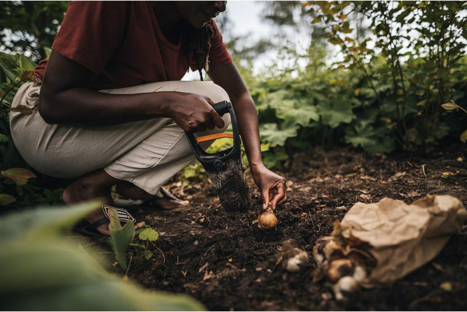 Product Description Bulb planter for easy and precise planting of bulbs and small seedlings in the ground - Digs and fills holes with a planting depth of up to 12.5 cm, Easy trigger to open the blade to release soil above the bulb - The drill blade is fast and efficient digging in circular movements, Made of durable and weather-resistant FiberComp material - Ideally suited for bulbs up to 6.5 cm in diameter, Lateral depth scale for accurate planting, Finnish design - Contents: 1x Fiskars Solid Flower Bulb Planter, Length: 24 cm, Weight: 258 g, Material: Plastic, Colour: Black/Orange, 1057079 Set Contains: 1x Fiskars Solid Flower Bulb Planter, Length: 24 cm, Weight: 258 g, Material: Plastic, Colour: Black/Orange, 1057079