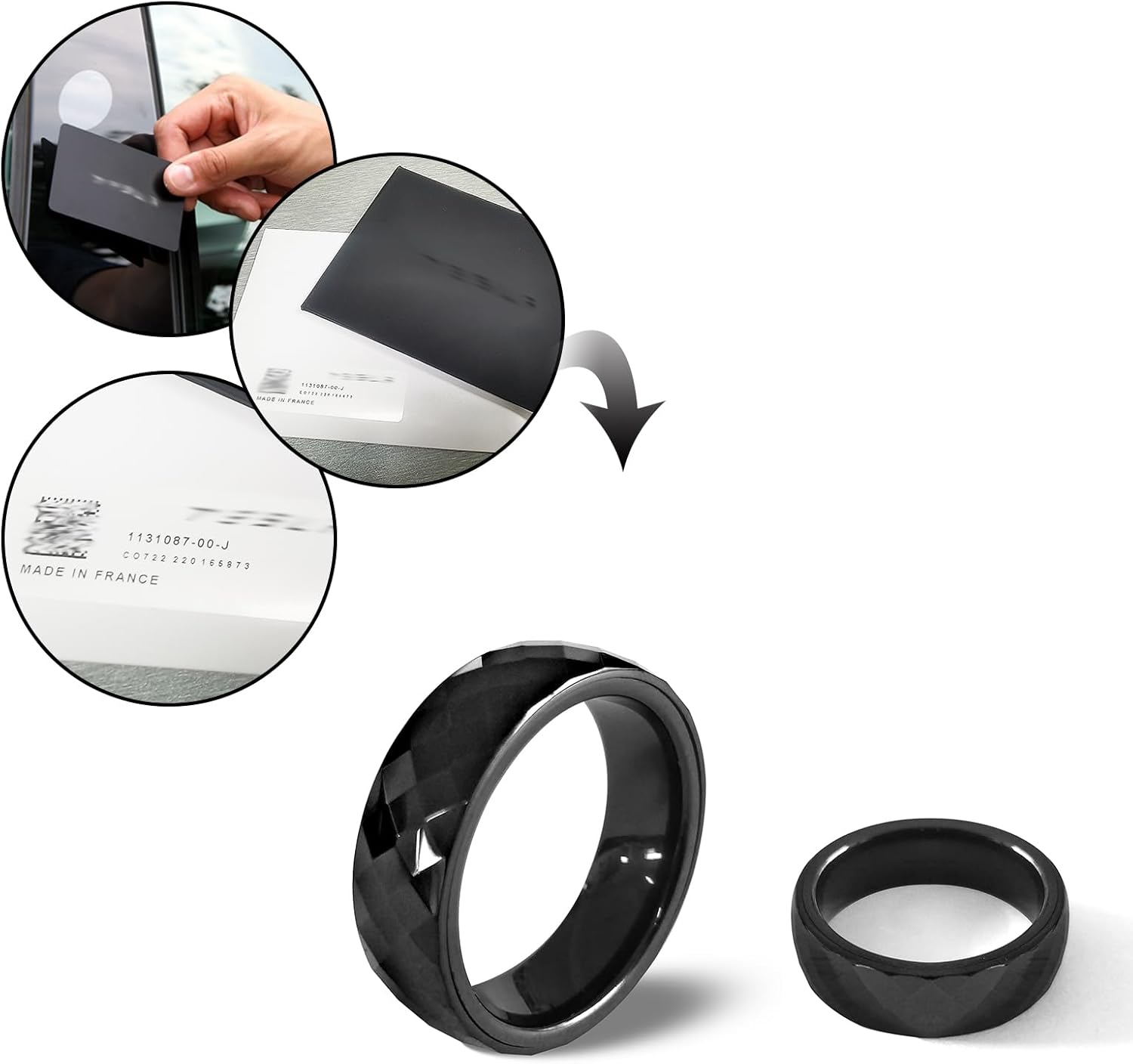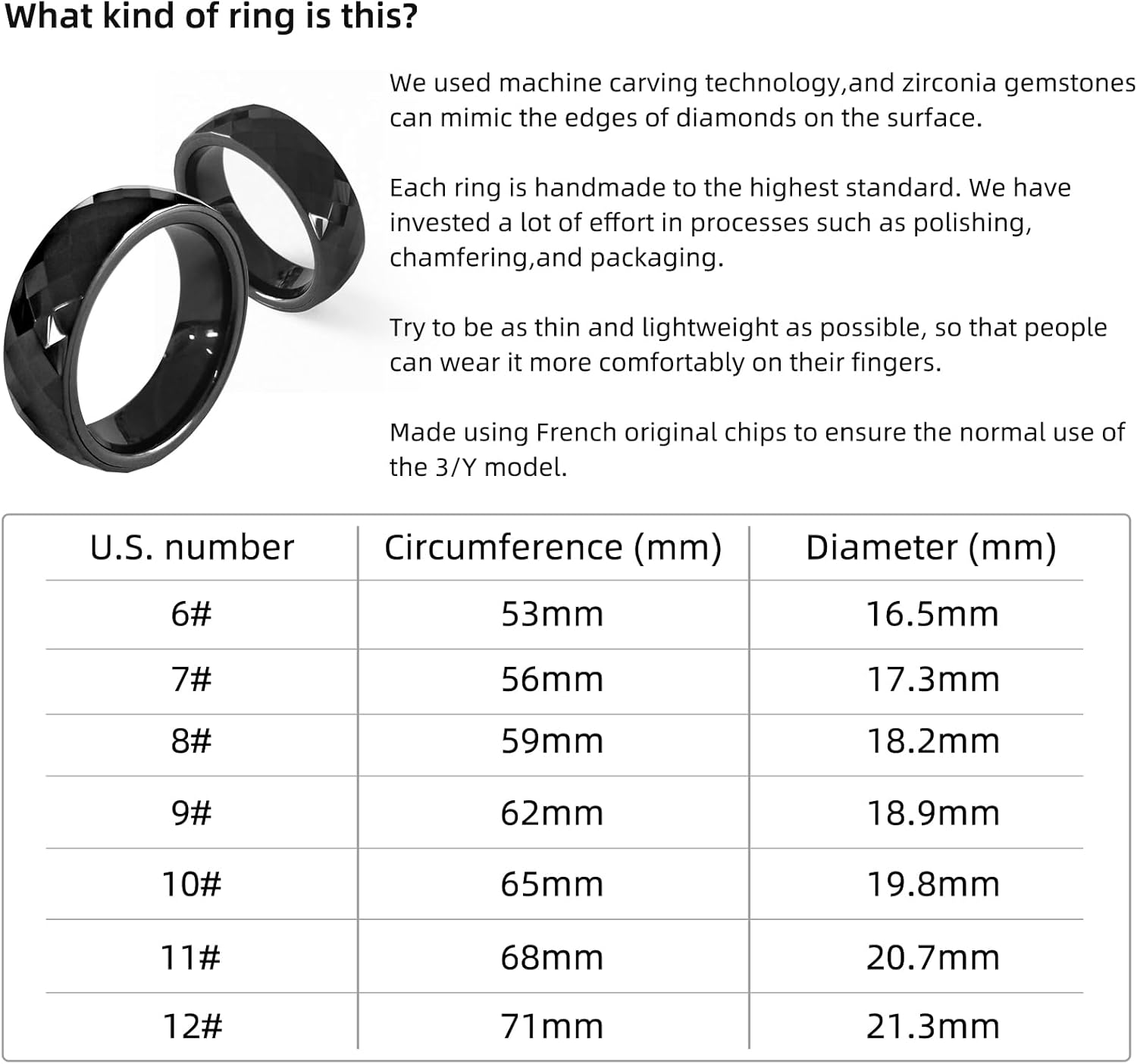 How to Activate Tesla Ring?1. Tap the little vehicle button in the lower-left corner of your screen.2. Tap "locks".3. Tap "+" your tesla model 3 or Model Y screen will show "add a phone key" or "add a key fob or key card".4. Put the smart key ring on center console area where you put your key card.5. The screen will show "tap existing key card to approve", then remove key ring and put your key card;【Specification】Name: Smart Ring for Model 3/YMaterial: Zirconia ceramicsSize: 6-12 US size (Conversion: 1 inch = 25.4mm or 1mm = 0.0393 inch)Fitment: Tesla Model 3 2017-2022, Model Y 2020-2022Width: 7mmColor: BlackTech: NFCBattery Life: Passive device with no batter