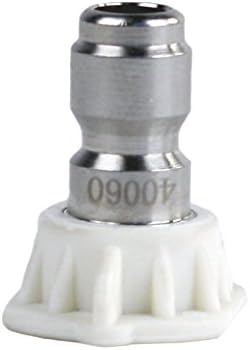 20 Pack of Erie Tools 5.5 Stainless Steel Orifice 40 Degree 1/4in. Quick Connect 4000 PSI High Pressure Washer Spray Nozzle Tips20 pack of Erie Tools 5.5 orifice, 1/4-inch Quick Connect, stainless steel, 40° nozzles that will handle up to 4,000 PSI. Nozzle Orifice Size: 5.5 Quantity: 20 Pack 40° nozzle high-pressure cutting spray tip Maximum PSI: 4,000 1/4-inch stainless steel insert. Delivers a concentrated stream that can gouge or cut. Through-hardened stainless steel orifices offer superior wear resistance. Stainless Steel housing resists cracking and wear. Resistant to most chemicals. Laser marked for clarity. Large, color-code surrounds nozzle tip for fast and easy identification of spray angle. 40° Nozzle Applications: Cleaning tar, glue, or stubborn stains from concrete or other hard surfaces. Removing caked-on mud from heavy machinery, and farm or lawn equipment. Cleaning overhead areas. Removing rust from steel and oxidation from aluminum. Caution: The spray force from these nozzles can cause bodily injury if pointed directly at the operator or others. Disconnect from spray wand before inspection. Make sure spray nozzle is properly locked in place with the quick coupler. The nozzle will become a dangerous projectile if it is not properly locked into position. Improper locking will also result in the o-ring being blown out of place.