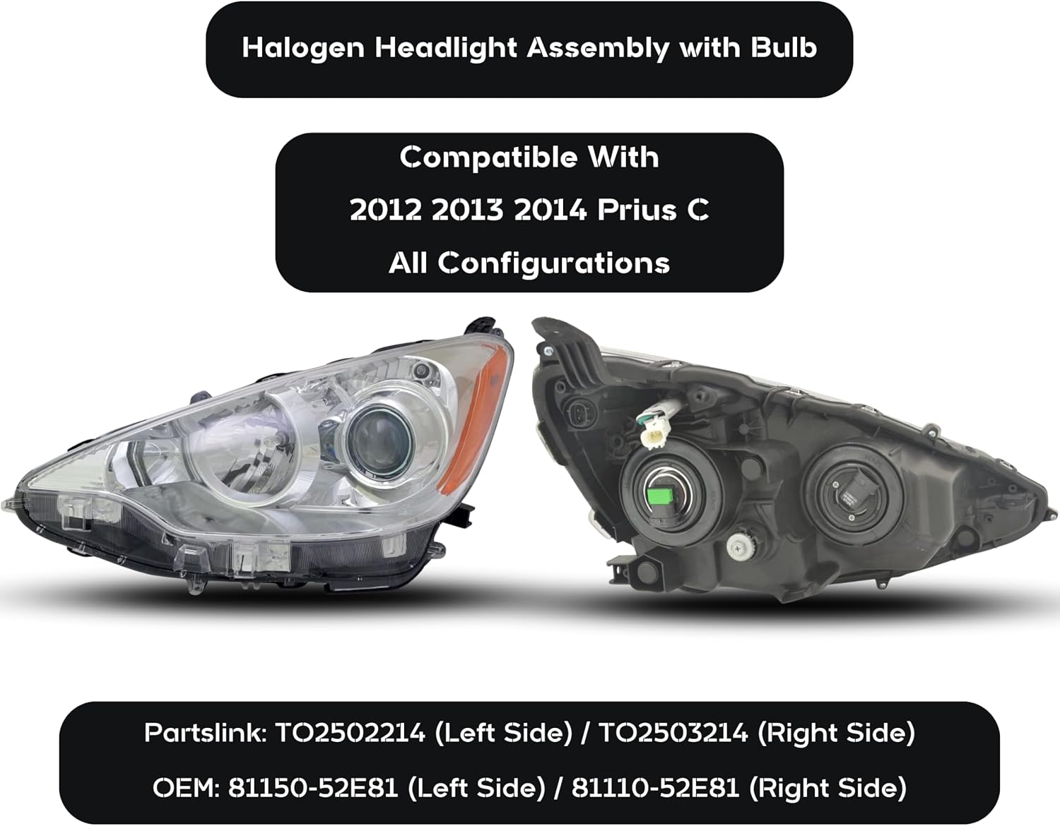 Replacement For 2012/2014 Toyota Prius C Halogen Headlight with Bulb, DOT/SAE Compliant, Left/Driver Side, Partslink TO2502214/ OEM 81150-52E81